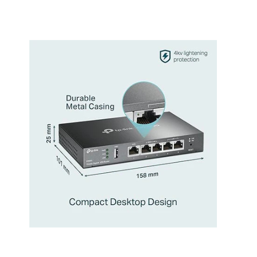 The TP-Link ER605 Omada Gigabit VPN Router and Load Balancer delivers secure and efficient business networking with advanced VPN support, intelligent multi-WAN load balancing, and centralized Omada SDN management. Designed for small to medium businesses, it ensures reliable internet connectivity, strong security controls, and scalable network management for offices, retail environments, schools, and growing enterprises.